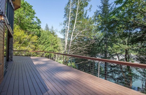 Outside, there's a deck, covered patio and lawn space. Just off the upper living area, the deck takes advantage of the views but is built with safety in mind. Instead of a traditional-style railing, cables are used below the rail to keep little ones (and clumsy big-ones) safe without obstructing the view. Up here, you feel like you're in the trees while looking down at the river.