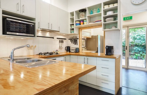 Features vast living area in original banking chamber with soaring 5 metre ceilings, romantic master bedroom, light and airy second queen bedroom, and third single bedroom located upstairs adjoining the mezzanine library. Note the second and third bedrooms are interconnected by a staircase. Full of original character as well as modern conveniences such as hydronic heating, ceiling fans and well-equipped kitchen and bathroom. Connect with nature in the rambling gardens and outdoor bath option. Step out the garden gate and you are within a short stroll of cafes, boutiques, and dining, with rolling hills as the backdrop to this very special place. Sleeps up to 6 if using trundle bed (on request only)