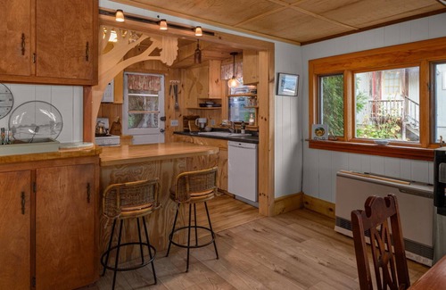 Downstairs indoor amenities include a newly renovated kitchen equipped with a gas stove, oven, microwave, coffee maker, refrigerator and dishwasher, a downstairs bedroom with double bed and French door to porch access, a full bathroom including bathtub/shower and both a washer and brand new dryer, a dining room and table that seats 10, a spacious living room with a usable stone fireplace and cable TV. Upstairs you’ll find a half bath, a single bed in an open bedroom layout, a sleeping porch including 4 single beds, and a master bedroom with lake views and a double sized bed.