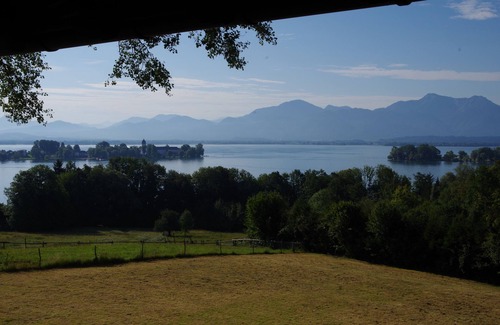 In the conservation area on the north side of Lake Chiemsee, this tastefully furnished, renovated apartment is 2017. It is part of a large country house, but concluded from this. The apartment is reached via a separate staircase. To the 65m ² apartment includes a living room with integrated kitchen and sofa bed (about 30m) ², a bedroom with double bed, a bathroom and two balconies. From the covered balcony you have a fantastic view of the lake and the underlying Chiemgau Alps. The lake is just below the property and is on foot or to reach dirt roads. The nearest swimming area is 5 minutes away on foot. The nearest village Gstadt in a port of the boats of the Chiemsee shipping store is within walking distance in 10 minutes. There you can rent electric, rowing and sailing boats, take windsurfing lessons or visit the bathhouse.