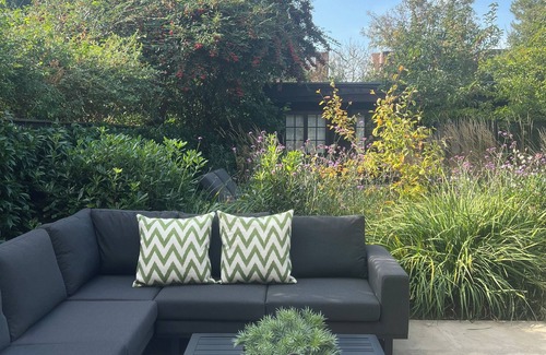 Stunning garden with seating, BBQ, fire pit and table tennis.