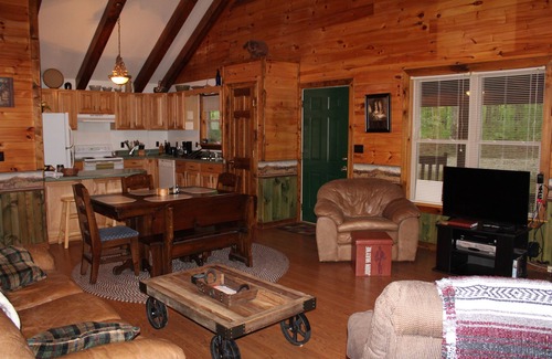 Very private 3BR/2BA cabin, fully furnished.Cabin has a washer and dryer, and kitchen is fully furnished with dishwasher, coffee maker, microwave, pots, pans, dishware, utensils, silverware, oven, refrigerator, ice maker, stove, and toaster. All linens & towels are furnished. Start up toilet paper & paper towels provided.There are three bedrooms two have a queen bed & the other one has two twin beds.