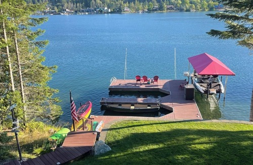Log cabin with upper balcony, lower patio outdoor living space and a 2 slip private dock all overlooking the water. This home is on the Pend Oreille river, 15 minutes from Sandpoint. Premises include 2 slip dock, beautiful landscaped yard, fire pit and hot tub. The pictures do not do it justice. Year round activities include: hiking, dining, swimming, shopping, boating, canoeing, paddle boarding, kayaking. Silverwood, Schweitzer Mountain, Coeur D Alene are all nearby.