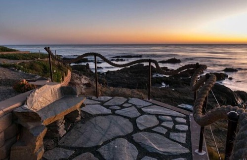 This beautifully remodeled oceanfront home features an open floor plan with spectacular panoramic ocean views. This spacious home offers two large bedrooms each with en suite bathrooms. The gourmet kitchen features upgraded cabinets, granite countertops and all new stainless steel appliances. The oversized kitchen island serves as both a chef station and eat-in bar. The great room boasts beautiful wood beam ceilings and a great stone fireplace. Watch the otters and sea lions play while you sip your morning coffee at your favorite perch in each room – all have magnificent views! BBQ every night on the natural flagstone patio as you watch the kayakers and paddle boarders go by. A private stairway in the back yard leads to the water, sandy beach and the most beautiful tide pools on the west coast. Large flat screen TV and wireless internet.