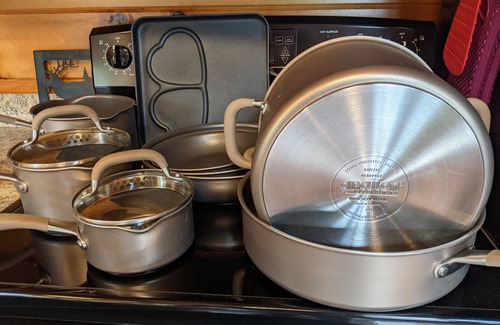 *Gourmet Kitchen, all quality and has everything:.Forest decor dishes, Ice maker, Coffee maker (Drip & Keurig), Air Fryer, Waffle maker, Slow Cooker, Rice Cooker, Blender, Toaster, Can opener, corks screw, Circulon pro Pots/Pans, Griddle, Quality Silverware, Glassware, Bar ware, bake ware, Silicone Cooking Utensils, Grilling Utensils including metal skewers for Shish kebab's, etc! Whirlpool quality & ease of use, I've got you covered in the kitchen including Salt/Pepper Grinders, spray oil, misc Spices, foil, parchment paper & Food storage containers!