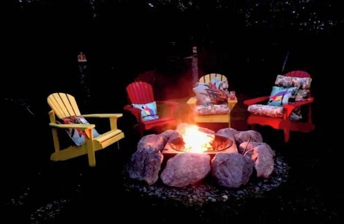 This cabin has 3 bedrooms, 2 full bathrooms, a bar, a screened in dining area with BBQ, hot tub, a deck on the pond with a fire pit. The upper deck has a place to lie down, a propane firepit and Adirondack chairs. A large grassed back yard with Adirondack chairs and fire pit.