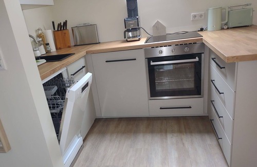 You will be staying in a 4-room house on 2 levels, with bright, modern, and cozy furnishings. The living/dining room is equipped with cable TV and a flat screen, and it has an exit leading to the terrace. There is one room with a double bed measuring 160 cm wide and 200 cm long. The open kitchen is well-appointed with a dishwasher, 4 induction hot plates, a toaster, a kettle, a microwave, a freezer, and an electric coffee machine. Additionally, there is a shower and a toilet on the ground level. Upstairs, you will find two rooms, one with two beds measuring 90 cm wide and 200 cm long, and another room with two beds of the same dimensions.