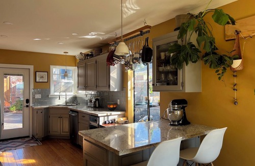 Our large kitchen with adjacent dining area is fully equipped for your cooking and baking needs, including granite countertops, stainless steel appliances, high quality cookware, and a greenhouse window.