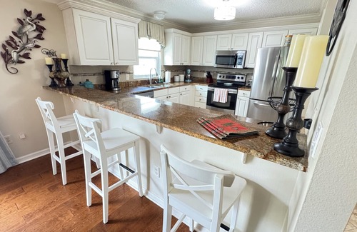 This luxury 2/2 villa (established Dec. ‘22) has all the bells and whistles you're looking for in a vacation rental. This is a stucco and block solid courtyard villa complete with luxurious engineered hardwood floors, granite countertops in the kitchen and bathrooms, stainless steel appliances, quality furniture - power recline leather sofa and chair from Baer Furniture, bedding, linen/towels, and all the kitchen essentials you could possibly need.