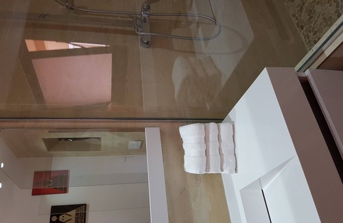 Travelers will have access to all parts of the apartment: bedroom and its dressing headboard, the kitchen and its island, the very comfortable sofa corner and the bathroom and its Italian shower.