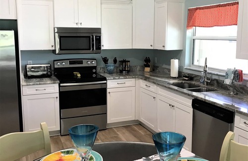 Kitchen is bright and spacious complete with SS appliances. A well-stocked kitchen has a large variety of cooking tools and utensils to ensure you feel at home. A Keurig is ready to brew your perfect morning coffee or use the 12-cup coffee maker if you prefer.