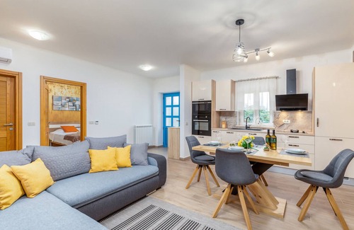The enchanting Villa Dussich is situated in a quiet village between Buje and Buzet, in the hilly interior of Istria. Only the ground floor of this charming terraced house is for rent and is divided into 2 apartments, ideal for a family holiday. There are a total of 3 bedrooms and 2 bathrooms, designed to accommodate up to 8 people. In addition to the elegant interior, you will be greeted by a spacious garden with a swimming pool, summer kitchen and children's playground with trampoline. There is no better setting for enjoying the company of your loved ones and getting away from the hustle and bustle of the city.