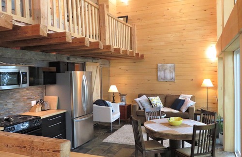 The entire main level has heated natural stone tile floors to keep your feet warm and cozy. Full sized kitchen with wooden countertops, under cabinet lighting, and drawer lighting. Table seating for four. Kitchenware is included, and coffee, tea, sugar and cream are also provided. Main living room area has a comfy pull out couch and second chair. Three piece bathroom with walk in curb-less shower, and a glass walled 6’ x 6’ sauna with a view of the lake.