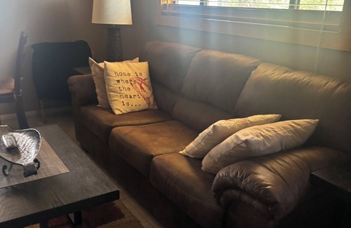 This 1-bedroom apartment is perfect for your escape to Prescott. The one bedroom has a comfortable King Size bed with two dressers and two closets. The living room has a queen bed in the couch as well as a kitchenette that includes a microwave, refrigerator, Keurig coffee maker (with coffee pods) as well as an air fryer and hotplate. There is also an oversized jumbo washer and dryer in the unit. Enjoy the excellent amenities like a mounted TV with cable, Netflix, Prime TV and more. Also includes WiFi. Located on a hill with beautiful views and private fenced yard with Astro turf. Quiet neighborhood located 5 mins to Prescott Downtown Square as well as shopping and dining spots. We are also 5 mins from Watson and Willow Lake. We look forward to welcoming you to our place as well as your friendly dog/s. I also have two super sweet dogs that have their own private yard. This apt. Is in the lower level of our home and there are some stairs going down to the apt. Parking is in the driveway or on the street!