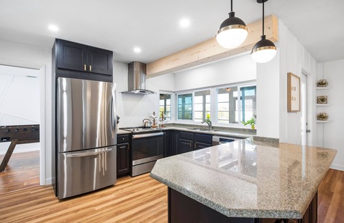 After working up an appetite from exploring all of Cocoa Beach, our modern kitchen has everything you could need for cooking and entertainment! The kitchen features quartzite countertops, beautiful backsplash, stainless steel appliances, and beautiful backyard views.
