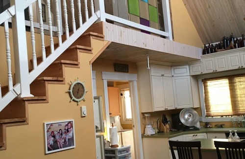 The main floor features an open concept living/dining and kitchen. The dining table seats three, and the bar will seat an additional three. The master bedroom, bathroom, and laundry are also located on the main floor! The second floor loft has two twin beds, and a blow up double. The living room has a queen size, pull out couch for two. The cottage will sleep up to 6 guests!