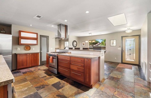Beautifully designed contemporary gem with fantastic views and spa like amenities. Panoramic Red Rock views are on display from most of the home including the two master suites. The main Living area is open concept with stunning red rock views from the dining area, kitchen and den. The Home soothes you with quietness and comfort. The heated stone floors warm your feet in the winter and keep you cool in the summer. Endless hot water allows you to indulge in leisurely relaxing showers after a day of hiking and the assortment of lighting can set the mood for a movie theater experience at night with the 55” flat screen TV. Two indoor spa tubs give you the choice of a champagne bubble bath or a jetted bath, there is a 6 person hot tub on the covered back patio overlooking the mountains. A perfect combination of wood, stone steel and glass make this home a joy to behold and will make your Sedona vacation, a vacation to remember. Walking distance to shopping, restaurants hiking trailhead and entertainment this home puts you close to everything while maintaining a private secluded atmosphere.