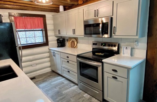 The cabin offers a beautiful rock fireplace and the feeling of a rustic lodge with modern amentities.