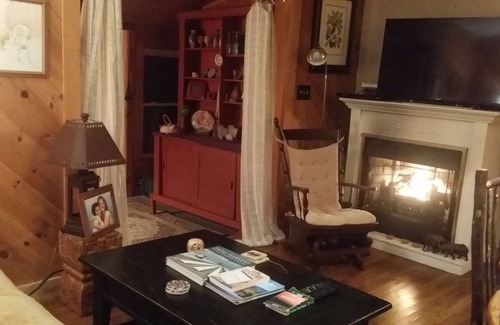 The cabin is all on one level except the 2 sunrooms which each have a step down into them (the one overlooking the woods is where the futon is) and the bathroom off the 2nd bedroom has a step down. Most of the floors are hardwood with tongue-in-groove oak walls which gives the cozy feeling of a mountain chalet. Parking is level and the house is easily accessible for mobility challenged individuals.