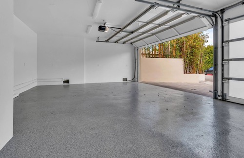 The property includes a three-car epoxy-coated garage with custom motorized doors, a paver driveway, and ample street parking. It has two central HVAC systems, high-speed internet with Eero coverage, and security cameras at the front gate, door, and garage.