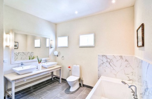 The outdoor spaces here at the villa are just as spacious and include beautiful lawn areas and palm trees, and a cabana lounge area - fully furnished for your comfort, and a fantastic spot for enjoying after-dinner drinks or relaxing with a good book. A covered dining terrace provides plenty of space for enjoying alfresco meals with the whole family, and there’s also a beautiful sun deck complete with luxurious loungers for soaking up some much-needed rays! The icing on The Palm Villa’s cake is its large private pool, which is easily accessible via Roman steps, making it easy for guests of all ages to get in and out of the water safely.
