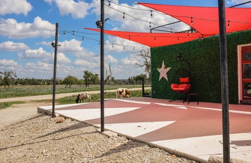 contemporary rustic extra large shipping container with 2 queen bedrooms, ceiling fans, TV's with a shared full bathroom bath, showcasing a led smart mirror and a luxury convertible futon sofa bed living room with garage door views of the Hill Country. Each room showcases with sliding glass door entry to a private 70 sqft patio, common access to a 1500 sqft slab patio, and a 400 sqft rooftop deck panoramic view of the hill country. We spared no expense to provide luxury to our guests