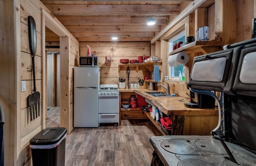 There is a full kitchen with all the amenities of home, a dining area and the best living room with a woodstove and T.V. to cozy up and watch movies on a brisk day. There is a full bathroom, and a stunning screened in porch.