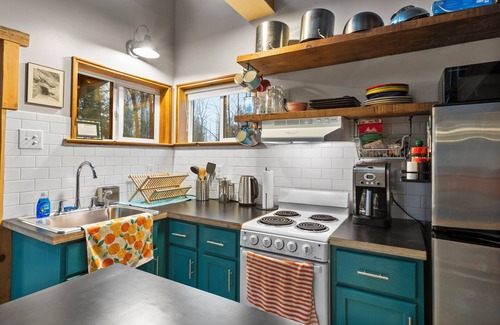 Kitchen:Big Leaf’s kitchen has an electric stove and oven, 3/4 size refrigerator, microwave, foot-pump sink, drip coffee pot, toaster, cookware, dishware, soap and kitchen linens . Next to the fridge you’ll find a 5-gallon water dispenser for your cooking and cleaning needs. We supply two 5-gallon jugs of potable water during your stay...just let us know if you need more!