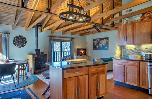Start the day with a hearty breakfast on the covered balcony, then head out the back door for a hike. This spacious, homey hideaway combines 14-foot vaulted ceilings with antique furniture, patterned fabrics, and a 400-square-foot deck!!!