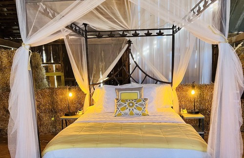 You are Glamping in a Barn!!! Surrounded by all the sights, sounds, and smells of a Barn, we have created a unique, romantic stay or family experience with hay carpeting, four poster, canopy bed, various lighting choices and lightly stocked kitchenette area. The kitchenette/lounge area is further complemented with a futon couch (sleeps 1 in comfort and two very closely :), bistro table, and dart board! Settle into your space with plenty of room to unpack into the chest of drawers and then watch a movie from your bed or dining table. Your smart tv is ready to continue watching your favorite series and if you need to work remote, the wifi is still at your service! Remember, there is NO heat and NO a/c. Please check the weather for the nights of your stay and prepare accordingly. Your queen size bed has a heated mattress pad (so does your futon). An Air Mattress is available or bring a few mats and sleeping bags! We also provide a fan during the warmer months. Still be especially prepared to sleep with warm pajamas and socks on those colder nights!