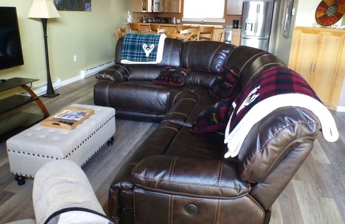 The chalet has an open floor plan with a cathedral ceiling, a stone fireplace that can be enjoyed while relaxing in the comfortable sectional sofa. Conveniently for the winter stays, literally every room has its own heating system, affording coziness wherever you are in the chalet!