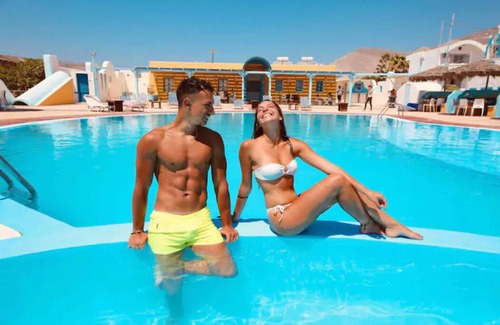 We are on the seafront on Perivolos Beach, just 300m away from a market in Perivolos and 100m away from the bus station in Perivolos.