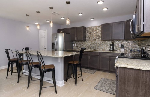 The kitchen is spacious with stainless appliances, upgraded countertops, and fully equipped with a coffee maker and microwave. Everyone can hang out around the island, with seating for five while dinner is being prepared.