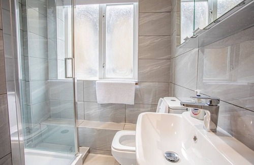 The bathroom is sleek and contemporary, featuring a glass-enclosed shower, modern fixtures, and fresh towels, ensuring a comfortable and refreshing experience.