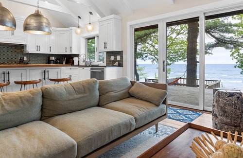 Experience the ultimate beachfront escape at Blue Horizon, a luxurious vacation rental nestled along the pristine shores of Lake Michigan with 200 private lake frontage. This beautiful home is tucked back in the woods on 3 private acres of land, creating a private setting for you and your family. When you step inside, you will find the perfect blend of modern elegance, natural textures, and coastal charm. The large deck provides panoramic views of the water with ample space to relax, grill, have a fire and take in the sunset. This home also has Fiber Internet Services of 1 GB speeds - perfect for those who need to work while on vacation and simply for you to just enjoy quick internet services.