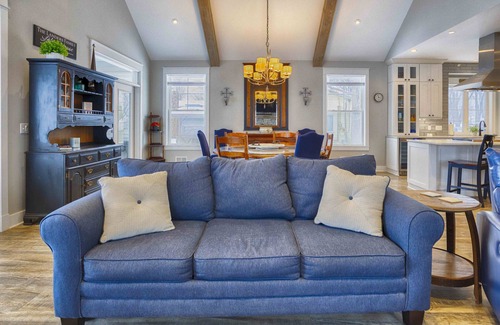 Happily find that the first floor of Blue Skies is wheelchair accessible! Inside, the foyer greats you. To the right, an airy hallway leads the way past the powder room, first floor office and laundry rooms. The great room features a custom-built gas fireplace with comfortable furniture and beautiful views of the lake. A round dining table with seating for eight sits between the kitchen and living area.