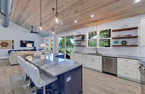 Our home on Lake Murray is perfect for your getaway, featuring an open floor plan that maximizes stunning lake views. The main living area has vaulted ceilings with tongue and groove pickled wood, creating a warm space for you to enjoy. The kitchen is spacious and stylized, with quartzite countertops, a large island that seats five, and beautiful finishes throughout. The flat lot ensures easy home entry, making it accessible for elderly guests. Relax on the screened-in porch while watching football or enjoy a drink at the outdoor high-top bar. Unwind in the sunken hot tub on the back porch as you take in the tranquil lake views. This home is the definition of serenity!