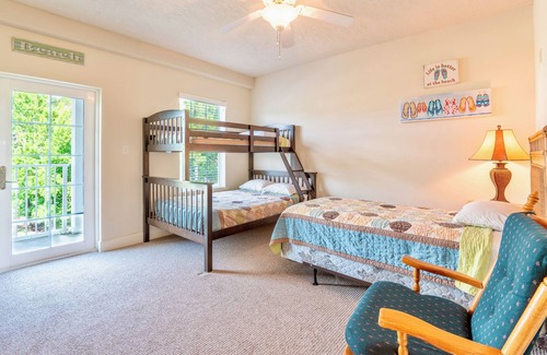 Bedroom #1 includes a twin-over-full bunk bed, a twin-size bed, balcony, and ensuite bathroom with a single vanity and shower/tub combo.