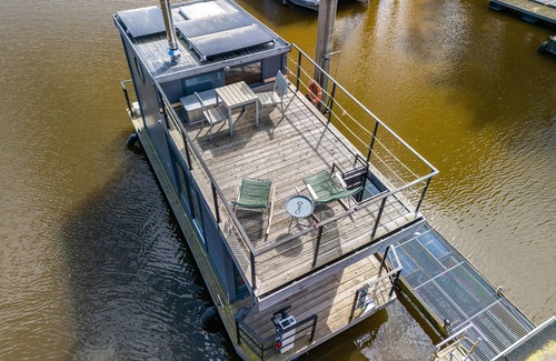 Another highlight is the roof terrace: here you can relax in rocking deckchairs while looking out over the water, you can let the sun shine on your stomach, have deep conversations on balmy summer evenings, enjoy being in silence and pop champagne corks while laughing. There is a barbecue and at night you can turn on fairy lights for a cozy atmosphere.