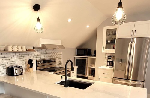 We’ve taken this century farmhouse and completely renovated it from top to bottom. Everything in this unique and spacious loft apartment is brand new and modern, including all kitchen appliances, stackable laundry, electric fireplace, large sectional, Endy beds, and more.