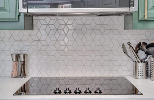 This spacious kitchen features wrap-around counters, plenty of cabinet space, and a unique geometric backsplash! Fully equipped with basic cooking essentials and stainless steel appliances, feel free to unleash your culinary prowess!