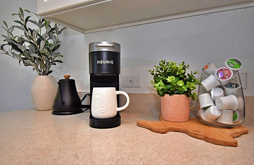 Show off your skills in the open-plan, well-stocked kitchen. Complete with glossy countertops and dewy, white cabinetry, it features stainless steel appliances, including a blender, coffee maker, dishwasher, oven, wine ware and refrigerator. Enjoy casual cocktails on the 2 bar stools and cozy family meals at the 6-seater dining table.
