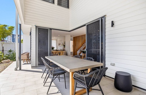This beautifully designed 3-bed, 3-bath home in Bokarina offers modern luxury and coastal relaxation. The bright, open-plan interiors feature sophisticated decor, timber floors, and earthy tones, with ducted A/C and ceiling fans throughout. The kitchen is sleek and fully equipped with modern appliances, whilst the spacious living and dining areas provide a homely feel. Each bedroom is comfortable, with a king, queen, and two single beds. Spa-style bathrooms with rain showers and a bath offer a luxurious way to wash the day away. A dedicated study room and Wi-Fi make it perfect for working remotely. Outside, enjoy alfresco dining in the backyard or relax on the front porch. With garage parking for two vehicles and just a short walk to Bokarina Beach and the renowned Boca Restaurant, this home combines elegance and convenience for the ultimate Sunshine Coast getaway.