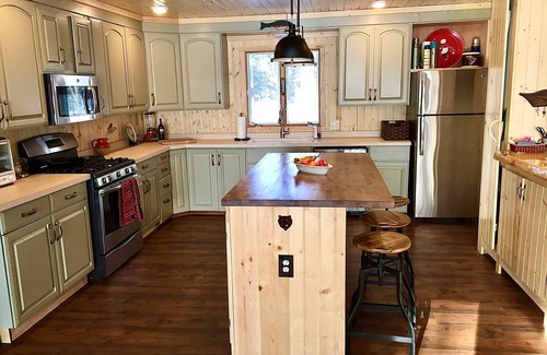 The first level offers a welcoming living area with a ping pong table and a rustic tongue and groove paneled family room with stone fireplace, huge comfy sectional and a smart TV for your entertainment. There are two additional bedrooms, one with a king bed and the other bunk room with two twins and a full-size bed providing plenty of space for everyone. Additionally, there is a full bath with tub and shower.