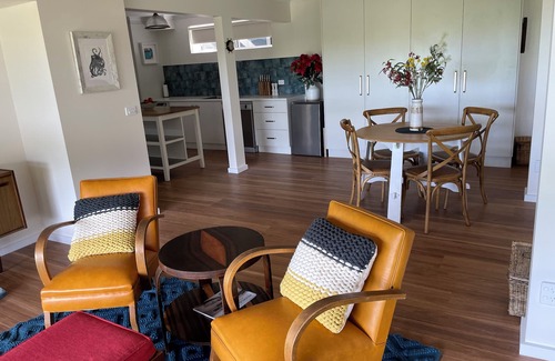 - One large open plan area with queen size bed, Smart TV (with all streaming apps), large couch, coffee table with two comfortable lounge chairs looking out through the trees to the ocean, rugs, dining table with four chairs
