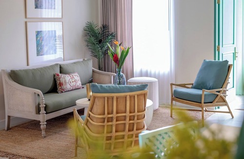 Casa Aquatica welcomes you with a bright, airy atmosphere that flows through its spacious living and dining areas. Thoughtfully designed, the living space features wicker lounge seating and vibrant, earthy accents, creating the perfect setting for a seaside retreat. The fully equipped kitchen, complete with a large island and bar seating, invites guests to gather and prepare meals together. The dining area features a beautiful wooden table that comfortably seats eight, perfect for sharing meals and creating memories.