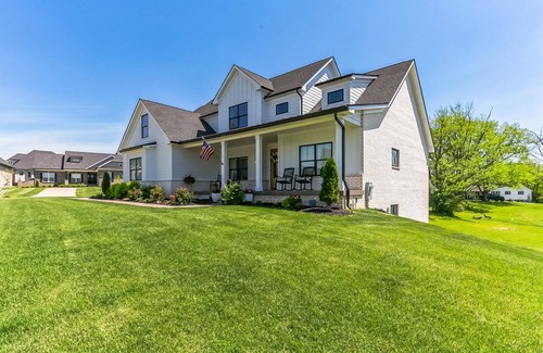 Enjoy your stay at the Kentucky Derby in this brand-new custom-built home (2022) complete with an indoor golf simulator! Located only 20 minutes from Churchill downs. There are 6 bedrooms (3 kings, 3 queens) each with luxury pillow top mattresses, high end linens, and large TVs. There are 3.5 bathrooms and the house is equipped with 2 extra-large hot water heaters! The walkout basement with 9’ ceilings is home to the ultimate golfer's dream, an indoor golf simulator! The Foresight GC Quad is the top-of-the-line indoor golf simulator. Choose to play from hundreds of premier golf courses around the world! Don’t worry about packing your clubs, we have a 2 full sets of Titleist clubs (men’s and women’s). Enjoy an evening relaxing after a day at the track on the peaceful covered back deck, with comfortable high end patio furniture and flat screen TV, or in one of the two massive living rooms. Use the fully stocked chef’s kitchen with top-of-the-line appliances and gas stovetop to enjoy all of your favorite meals. Attached 2 car garage includes Tesla Charging station.