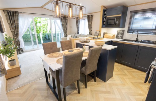 The living area is thoughtfully designed as an open, sociable space with a large and comfortable L shaped sofa, patio doors opening onto the decking and a dining area adjacent to the kitchen.