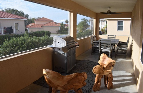 The villa has a super large screened-in porch with a gas BBQ grill, table and chairs, sitting area and view of the Marina!