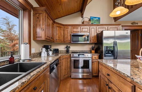 The kitchen is granite with high end appliances - everything you need to cook a quick breakfast to a full Thanksgiving dinner! There is an open dining area and the breakfast bar for plenty of seating. Ther is also a full size washer and dryer and we have free WIFI and cable tv.